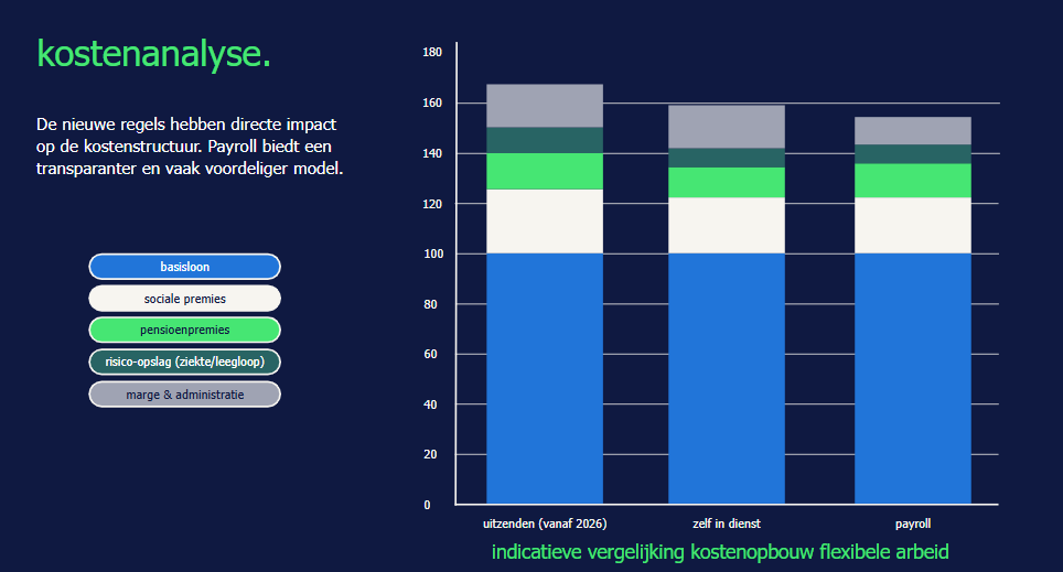 Met Payroll behoud je werkgever regie over wie er aangenomen wordt, maar worden risico’s, administratieve lasten en juridische verantwoordelijkheden uitbesteed, wat met de nieuwe wetgeving vanaf 2026 aantrekkelijk kan zijn voor jou als opdrachtgever. Payroll biedt nu al de zekerheid en voorwaarden waar uitzenden straks aan moet voldoen, maar dan zonder de complexiteit en extra kosten.